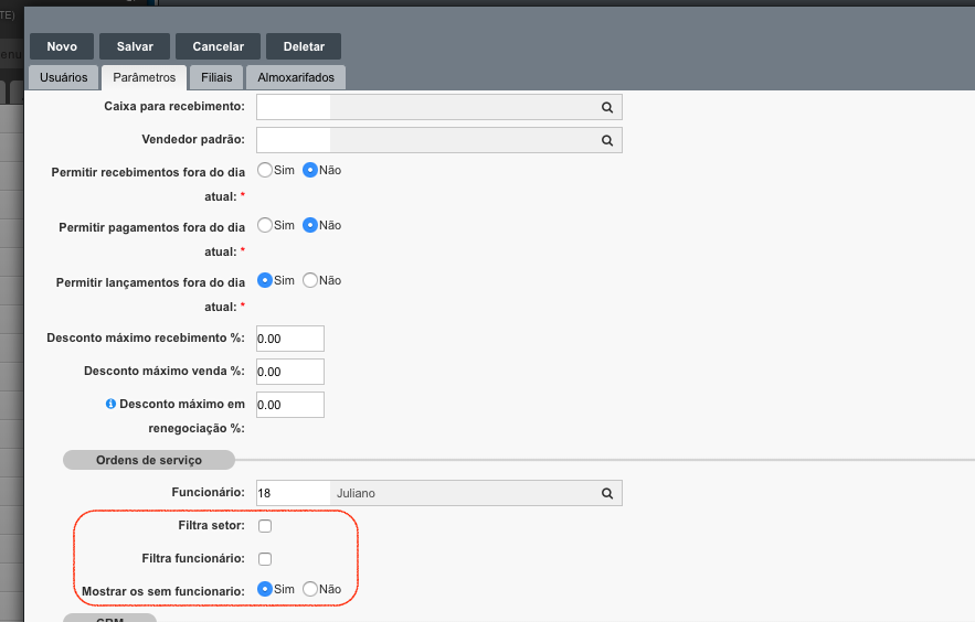 Na guia parâmetros, a IXC recomenda remover os filtros de filtrar setor e filtrar funcionário para o usuário da API caso o mesmo vá trabalhar com ordens de serviço.