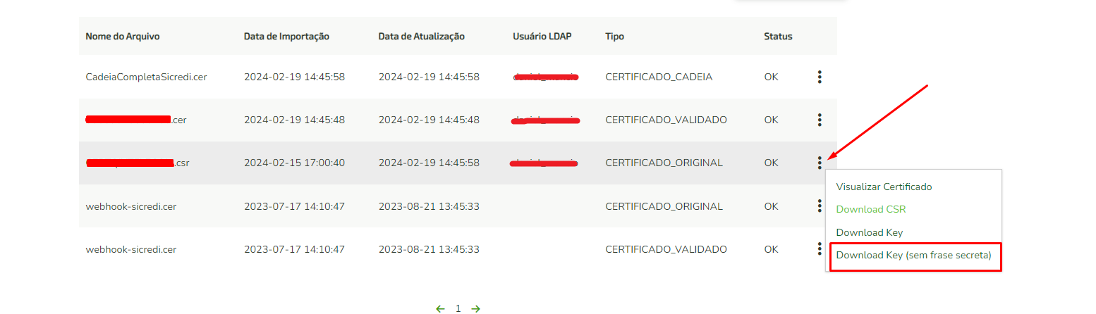 Clique na linha do CERTIFICADO_ORIGINAL e depois em Download Key (sem frase secreta) e salve o arquivo com o nome CHAVE_PRIVADA