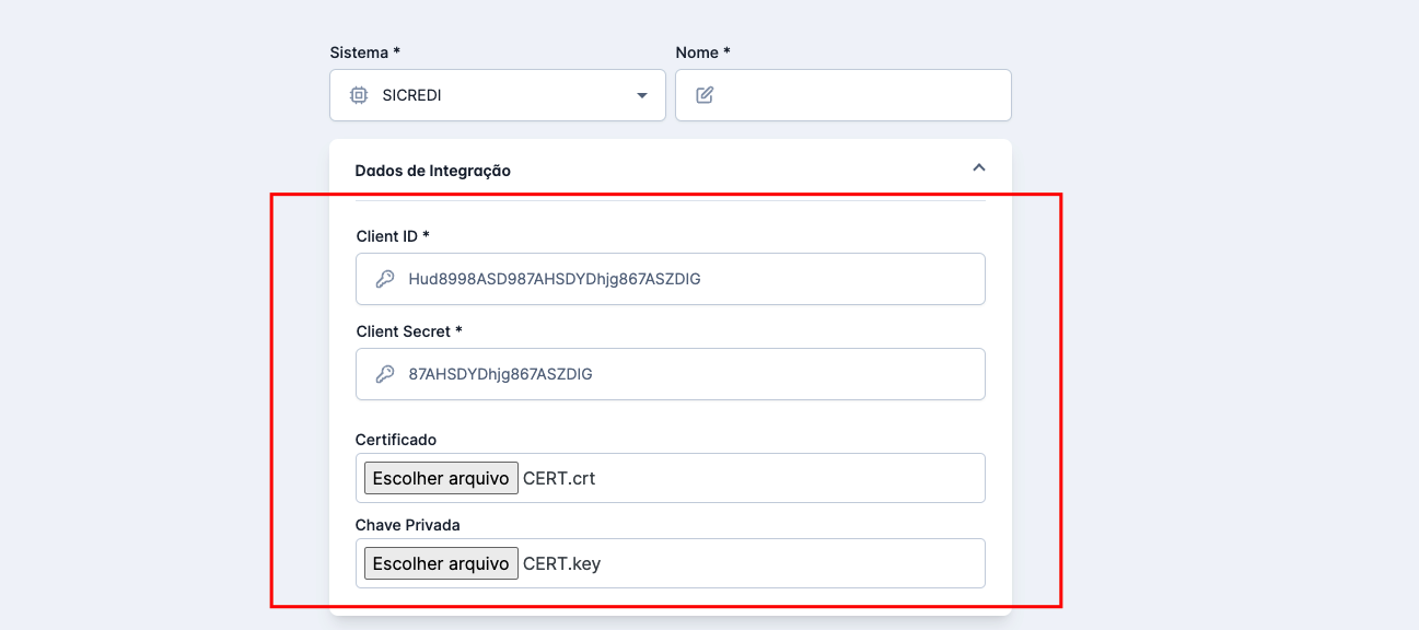 Selecione o sistema PIX Sicredi, coloque um nome de sua preferência e em seguida as informações que geramos no Sicredi Client ID, Client Secret e anexe os arquivos baixados do certificado e chave privada.