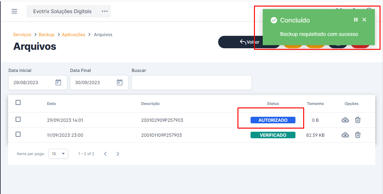 Será gerado um novo registro como AUTORIZADO, mas não se preocupe o backup será enviado e verificado em segundo plano.